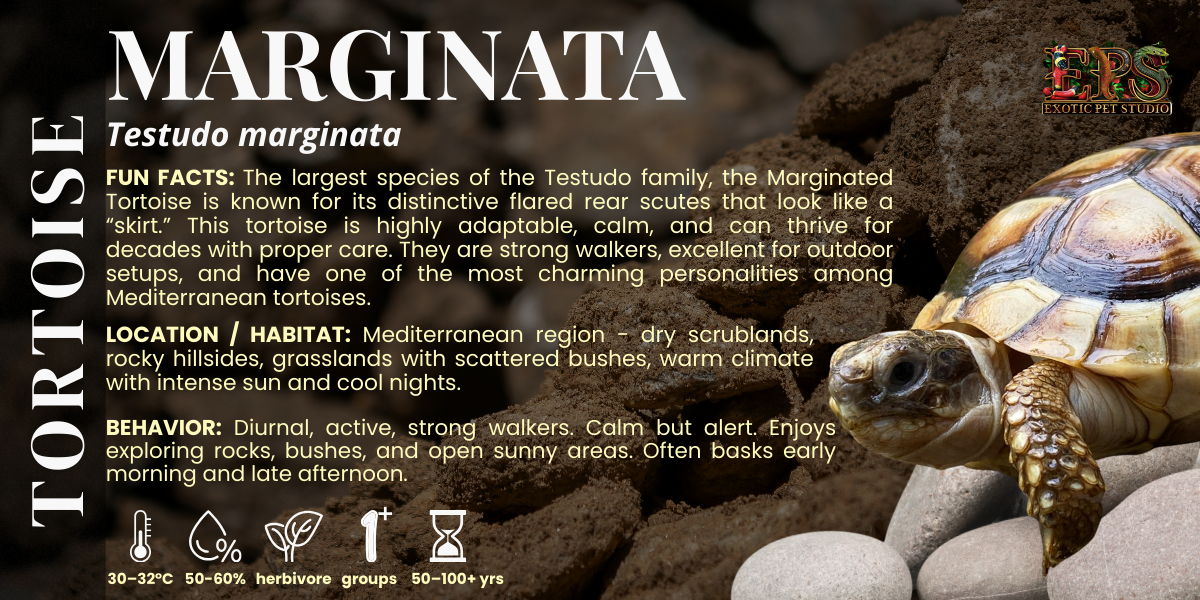 Kura Marginata (Testudo marginata) merupakan salah satu jenis kura darat eksotis dengan ciri khas cangkang yang melebar di bagian belakang, memberikan tampilan elegan dan berbeda dibandingkan kura darat lainnya. Spesies ini dikenal memiliki karakter relatif tenang dan aktif di siang hari. Produk ini cocok untuk kolektor maupun pemelihara yang ingin naik level dalam dunia reptil darat, dengan pendekatan perawatan yang lebih terarah dan konsisten. Setiap individu dipilih secara selektif dalam kondisi sehat, nafsu makan baik, dan siap beradaptasi pada setup kandang natural maupun bioactive dengan pengaturan lingkungan yang sesuai.