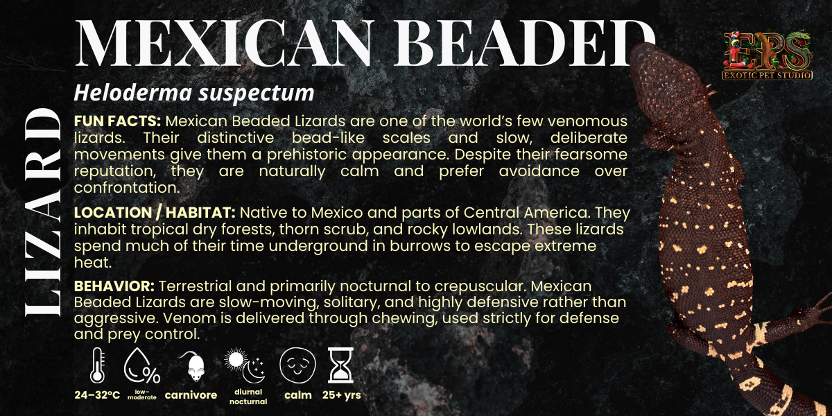 Mexican Beaded Lizard (Heloderma horridum) adalah kadal berukuran besar dengan tubuh kokoh dan pola kulit khas menyerupai manik-manik. Spesies ini termasuk salah satu dari sedikit kadal berbisa di dunia dan memiliki karakter cenderung tenang namun defensif. Direkomendasikan khusus untuk pemelihara berpengalaman yang memahami prosedur keamanan, penanganan yang tepat, serta mampu menyediakan kandang terkontrol dengan suhu dan lingkungan stabil.